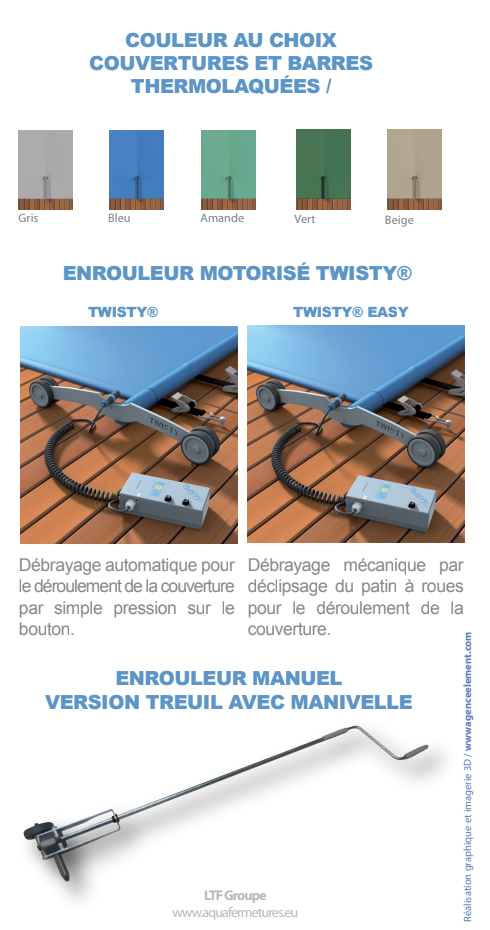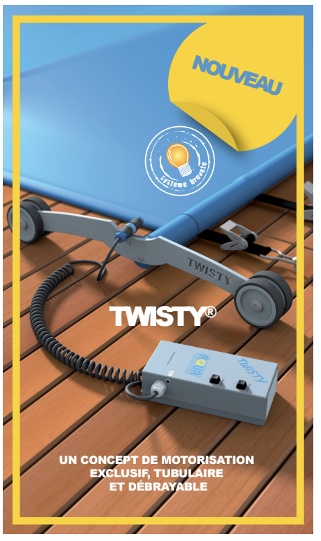 Grâce à son insertion dans le tube d’enroulement, Twisty® est une solution simple, discrète et écono mique qui permet l’enroulement rapide et sans effort de la totalité de la couverture. 2 versions existent : Twisty® à débrayage automatique* ou Twisty® Easy à débrayage mécanique. Sans contrainte car sans fil, Twisty® se connecte très simplement votre couverture à barre et se recharge sur secteur après chaque utilisation. Une piscine bâchée de 6m de long se découvre ainsi en 1mn seulement. Twisty® peut être équipé d’une manoeuvre de secours, à treuil.