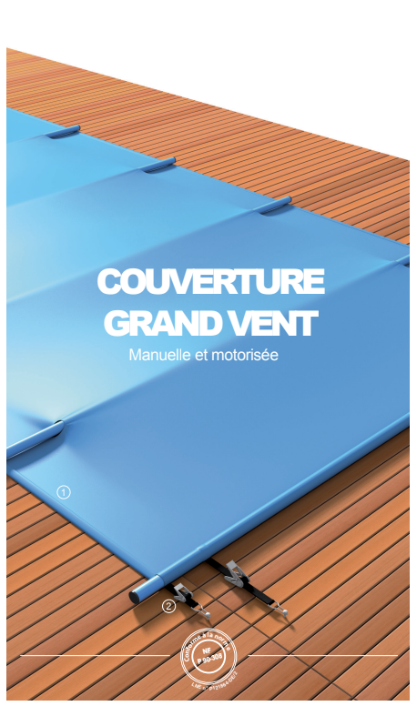 Dans les régions particulièrement exposées au vent et pour renforcer leur solidité, notre couverture à barres Grand vent bénéficie de deux sangles de renfort cousues dans un ourlet (1) en bordure de couverture et maintenues par 4 attaches supplémentaires (2) de part et d’autre qui permettent de plaquer au mieux la couverture au sol, évitant ainsi que le vent ne s’engouffre dessous. Disponible en taille standard ou réalisée sur mesure, notre couverture à barres est conforme à la norme NFP 90-308.