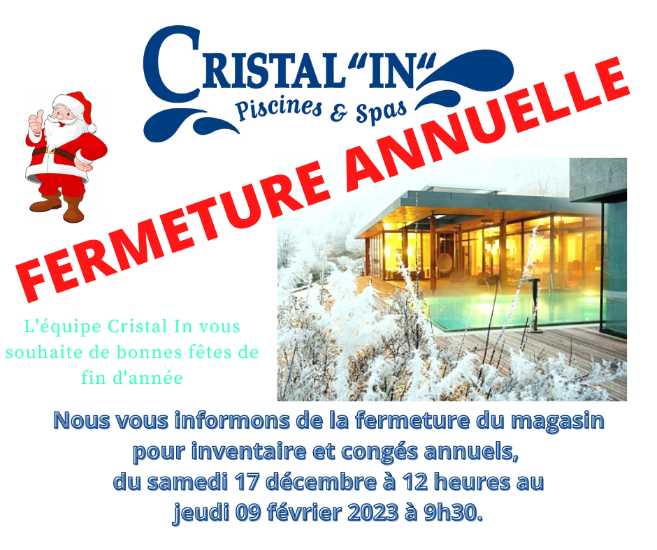 📅 Du mercredi 17 décembre 2025 à 18h au mardi 3 février 2026 à 9h30 Votre magasin Cristal In Piscines & Spas ferme ses portes...