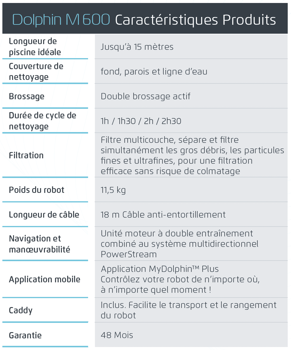 Un minimum d’efforts et de contraintes pour un maximum de performances. Le tout nouveau robot nettoyeur de piscine Dolphin M 600 de Maytronics facilite à l’extrême l’entretien de votre piscine, toujours propre et prête pour votre plaisir, avec un minimum de contraintes et d’efforts.
